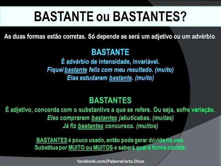 Segunda observação: apesar do exemplo do slide não tocar nesse detalhe, a palavra BASTANTE, enquanto adjetivo, também pode ser utilizada no singular: “Ela aprendeu BASTANTE coisa com o livro que ganhou".